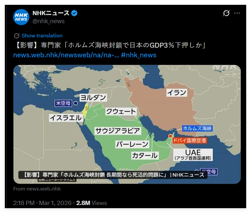 这家日本媒体在另一篇报道中还引用多位日本经济专家的分析称,如果这场战争发展成持久战,令霍尔木兹海峡长期无法通航,还将给日本许多行业的生产和运输——包括农业和渔业——都造成冲击,因为电费燃气费等一系列成本都会大幅增加。日本的GDP甚至可能因此被拉低三个百分点,演变成对日本“生死攸关的问题”。