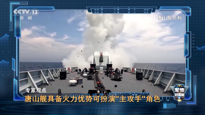 总台军事评论员 魏东旭:从吨位和综合作战能力看,唐山舰是参演作战舰艇的主力。一方面,它可作为海上联合编队的指挥员和核心战斗员,利用大型相控阵雷达对广阔区域进行侦察,打造千里眼,拥有强大的信息处理与共享能力。另一方面,它能够发挥火力优势,担当联合演习的主攻手角色。