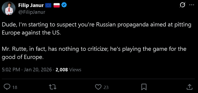 此外,在欧洲网民之中还存在另一种让人相当惊愕的声音。因为这种声音居然认为,像上述这种斥责吕特出卖欧洲,并认为欧洲应该在美国面前更硬气一点的言论,是在帮俄罗斯等其他国家“挑拨美欧关系”。