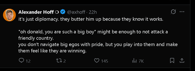 不过,也有人认为,吕特的这番看似相当“谄媚”的信息,其实是一种策略,通过说美国总统“喜欢听”的话,从而在谈判桌上争取主动。