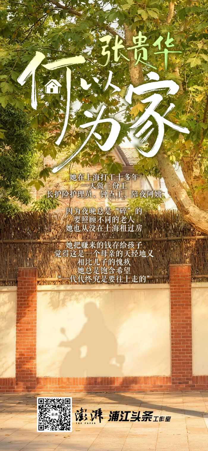 张贵华至今没完整读过儿子的获奖作品,但不妨碍她为此骄傲。她在上海十多年,一天做三份工,长护险护理员、钟点工、陪夜阿姨——靠着奔波,月入近一万五。她从没在上海租过房,因为夜晚总是“碎”的,要照顾不同的老人。她实际用钱的地方几乎只有话费,攒下的钱,义无反顾填向儿子的房子、车子、孩子,填向下一代有望被改写的命运。