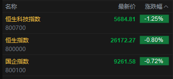 今日港股三大指数集体低开,恒生指数跌0.80%,报26172.27点,恒生科指跌1.25%,国企指数跌0.72%。盘面上,科网股普跌,快手、腾讯、网易、百度、阿里巴巴跌超1%;保险股低开,友邦保险跌超1%;黄金股回调,赤峰黄金跌超2%;汽车股走弱,小鹏汽车跌超7%。