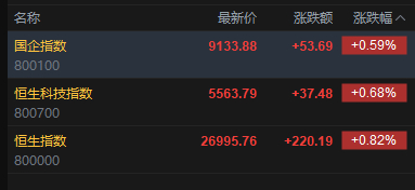 今日港股三大指数集体高开,恒指开盘涨0.82%,报26995.76点,恒科指涨0.68%,国企指数涨0.59%。盘面上,科网股普遍上涨,网易涨超3%,哔哩哔哩涨超2%,阿里巴巴、快手涨超1%;黄金股回暖,紫金黄金国际涨超4%;中资券商股活跃,招商证券涨超1%;芯片股高开,兆易创新涨超5%。今日东鹏饮料(9980.HK)上市平开。