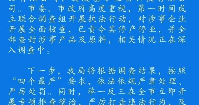 3月15日,成都市市场监管局发布情况通报:央视“3.15”晚会曝光“漂白鸡爪”“‘万能神药’外泌体”问题,涉及我市蜀福香食品有限责任公司、明扬食品有限公司、婕波噻尔生物科技有限公司。市委、市政府高度重视,第一时间成立联合调查组开展执法行动,对涉事企业开展全面核查,已责令其停产停业,并全部查封涉事产品及原料,相关情况正在深入调查中。