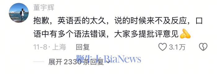 随后,11月8日,董宇辉在“辉同行”评论区回应称:“抱歉,英语丢的太久,说的时候来不及反应,口语中有多个语法错误,大家多提批评意见。”