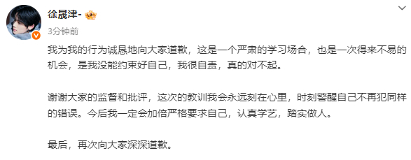 11月14日,徐晟津发文道歉:“我为我的行为诚恳地向大家道歉,这是一个严肃的学习场合,也是一次得来不易的机会,是我没能约束好自己,我很自责,真的对不起。谢谢大家的监督和批评,这次的教训我会永远刻在心里,时刻警醒自己不再犯同样的错误。今后我一定会加倍严格要求自己,认真学艺,踏实做人。最后,再次向大家深深道歉。”