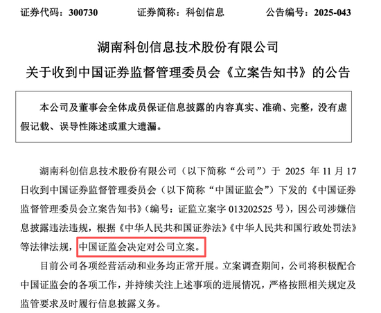 11月17日晚,科创信息(300730)公告,公司于2025年11月17日收到中国证监会下发的《中国证券监督管理委员会立案告知书》,因公司涉嫌信息披露违法违规,中国证监会决定对公司立案。