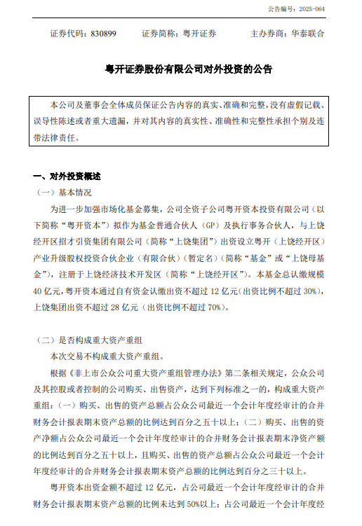 投资界(ID:pedaily2012)消息,11月24日,粤开证券发布公告,公司全资子公司粤开资本投资有限公司(以下简称“粤开资本”)拟作为基金普通合伙人(GP)及执行事务合伙人,与上饶经开区招才引资集团有限公司(简称“上饶集团”)出资设立粤开(上饶经开区)产业升级股权投资合伙企业(有限合伙)(暂定名)(简称“基金”或“上饶母基金”),注册于上饶经济技术开发区(简称“上饶经开区”)。本基金总认缴规模40 亿元,粤开资本通过自有资金认缴出资不超过 12 亿元(出资比例不超过 30%),上饶集团出资不超过 28 亿元(出资比例不超过 70%)。