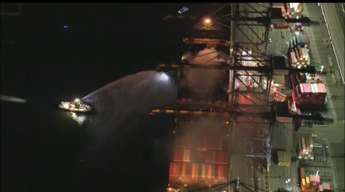 美国洛杉矶港一船只起火 超百名消防员前往现场