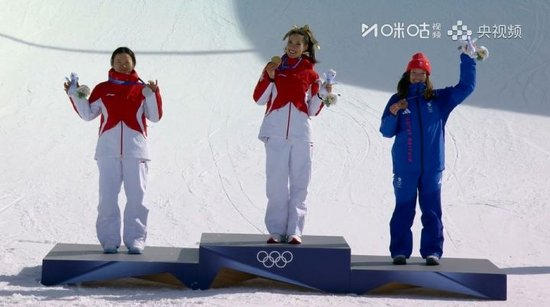 颁奖仪式上,谷爱凌头戴金色冠军头纱,唱国歌并展示微笑金牌,随后谷爱凌和李方慧一同身披国旗庆祝。