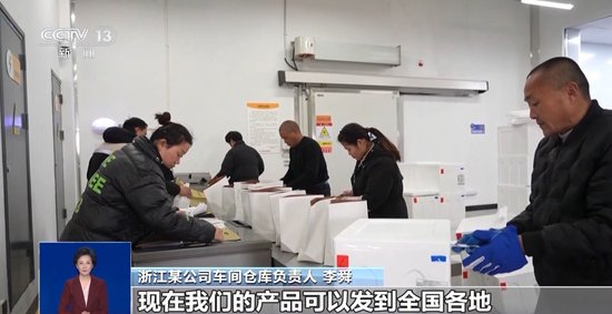 浙江某公司车间仓库负责人 李舜:以前我们的产品主要发往华东地区,现在我们的产品可以发到全国各地,消费者只要在家里面通过手机上面点一点,年货轻轻松松送到家门口。