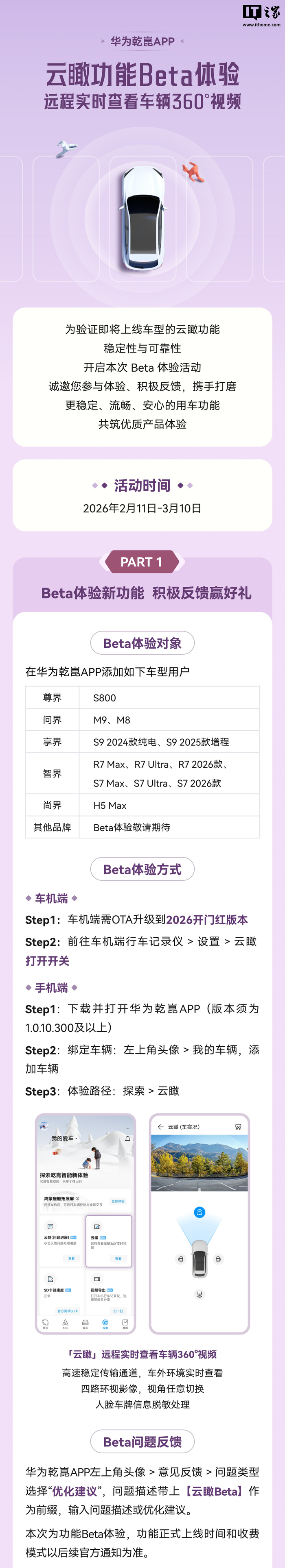 IT之家 2 月 12 日消息,华为乾崑官方产品经理昨日宣布,鸿蒙智行部分车型开启哨兵增强模式云瞰功能 Beta 体验,支持远程实时查看车辆 360° 视频等。