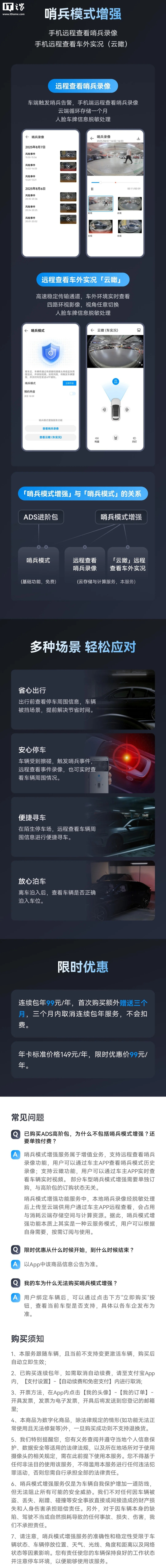 参考IT之家此前报道,去年 9 月 9 日,华为宣布推出 HUAWEI ADS(乾崑智驾)哨兵模式增强,新增支持手机端查看哨兵模式录像和车外实况功能(云瞰),年卡限时优惠价 99 元。