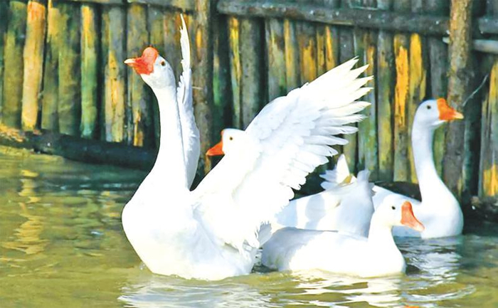 鹅群放牧 第一次放牧,要选择没有风的晴天,给小鹅喂完食,把它们赶到附近草地上,让它们自由活动,活动1小时后,就让鹅群回棚休息,以后慢慢延长放牧时间。3个星期后,白天可以完全放牧,只在晚上喂一次料,4周以后,晚上也不用补料。一般250~300只鹅为一群,由两人管理比较合适,最好把鹅群赶成长方形,让它们慢慢前行,不能太快太散,要让所有的鹅都吃上草料。早晨天一亮,就可以把鹅群赶出棚,让它们吃露水草。