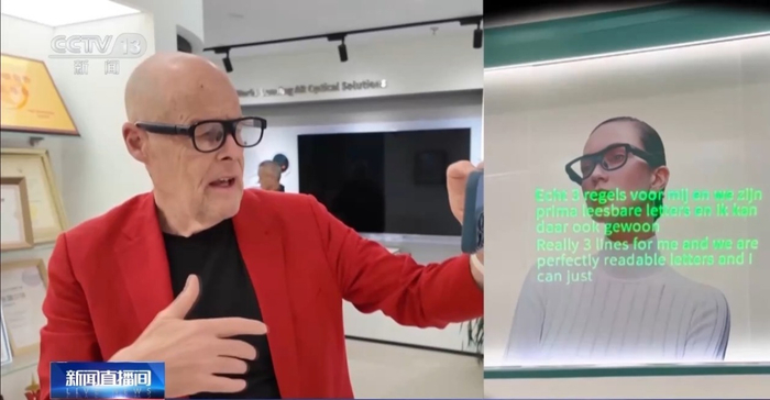 一位来自荷兰的博主正在北京亦庄一家企业里,体验一副比鸡蛋还轻的眼镜,这副AI眼镜能让消费者与全球100多种语言的使用者实时、流畅地对话。