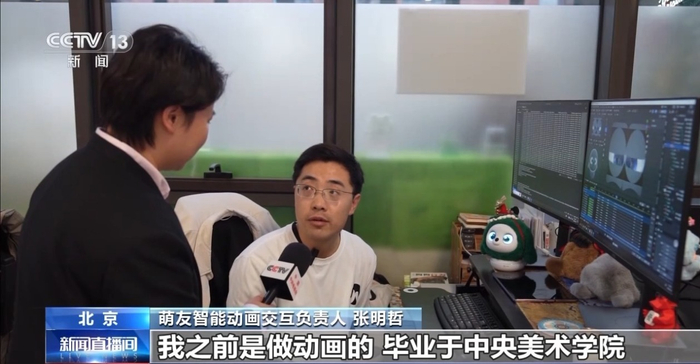 萌友智能动画交互负责人 张明哲:我之前是做动画的,毕业于中央美术学院,其实是赋予机器人更有“生命感”,这也是做动画里面去更有“灵性”的一个体现。比如眼神要看向一个人的时候,它具体的视角,这些都是源于动画设计里面最底层的技术规则。